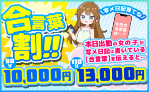 ※本日出勤の女の子の写メ日記に書いてある【合言葉】をお伝えください。